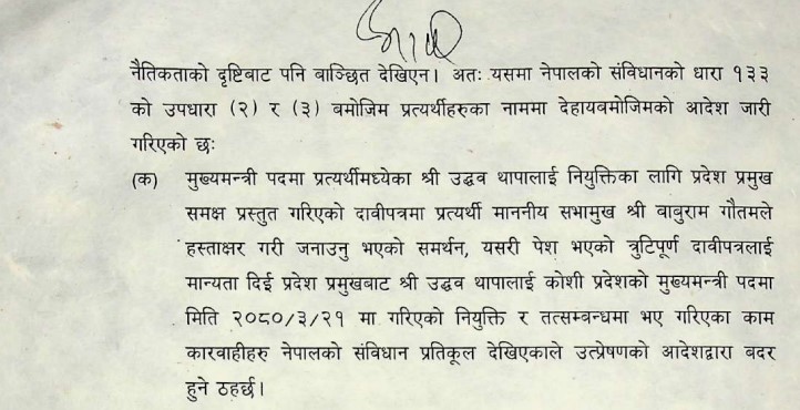 त्यही विवादमा सर्वोच्च अदालतले गत भदौं ११ गते सभामुखको मत लिएर सरकार गठन गर्ने प्रयासलाई गैरसंवैधानिक भनेको थियो । सभामुखले कुनै पनि खालको “राजनीतिक पक्षधरता देखाउन नहुने” र सो पदमा नियुक्त भइसकेपछि “स्वतन्त्र र तटस्थ” रहनुपर्ने, प्रदेश सभाका सबै राजनीतिक दल सदस्यहरूप्रति सभामुखले “समान दूरी र समान व्यवहार कायम राख्नुपर्ने”, “रेफ्री वा एम्पायर”को भूमिका खेल्नुपर्ने आदेशमा भनिएको थियो ।