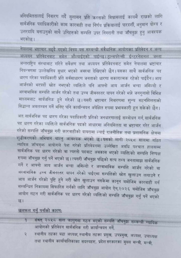 नेपाली काँग्रेसका महामन्त्री विश्वप्रकाश शर्माले प्रधानमन्त्री पुष्पकमल दाहाल प्रचण्डलाई सार्बजनिक अपिल गर्दै रास्वपाको माग अनुसार २०४७ यता सार्बजनिक पद धारण गर्ने सबैको सम्पत्ति उपर छानबिन गर्न उच्चस्तरीय समिति बनाउन आग्रह गर्नु भएको छ ।