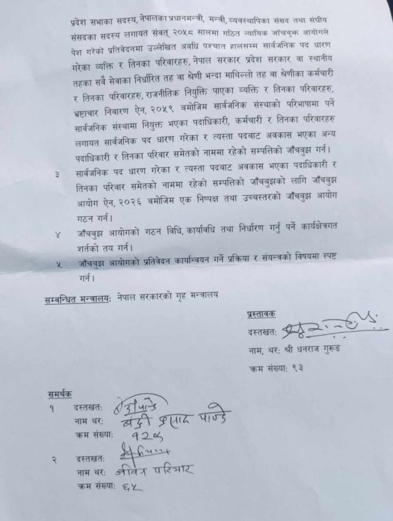 कांग्रेस उपसभापति गुरुङसहित सहमहामन्त्रीद्वय बद्रीप्रसाद पाण्डे र जीवन परियारले गत चैत २३ गते संसद् सचिवालयमा दर्ता गरेको उक्त प्रस्तावमा २०४८ सालमा गठित न्ययिक जाँचबुझ आयोगको प्रतिवेदन सार्वजनिक एवम् कार्यान्वयन गर्न माग गरिएको छ । त्यसपछि सार्वजनिक पदधारण गरेका वा उच्च ओहोदामा रहेको व्यक्तिको सम्पत्ति छानविन गर्न जाँचबुझ आयोग ऐन अनुसार छानविन आयोग गठन गर्नुपर्ने उल्लेख गरिएको छ ।