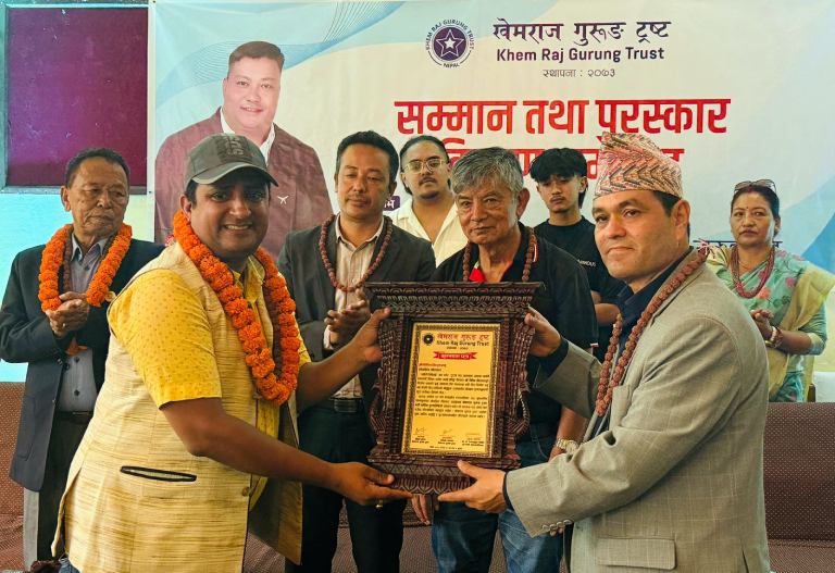 काठमाडौँ। दिवंगत गायक खेमराज गुरुङको नवौं वार्षिक पुण्यतिथिको अवसरमा खेमराज गुरुङ ट्रस्टले सम्मान तथा प्रतिभा पुरस्कार प्रदान गरेको छ। राजधानीमा आयोजित औपचारिक समारोहमा यस वर्षको श्रस्टा सम्मान गायक क्षेत्र बहादुर गुरुङलाई र प्रतिभा पुरस्कार गीतकार विपिन किरणलाई प्रदान गरिएको हो।