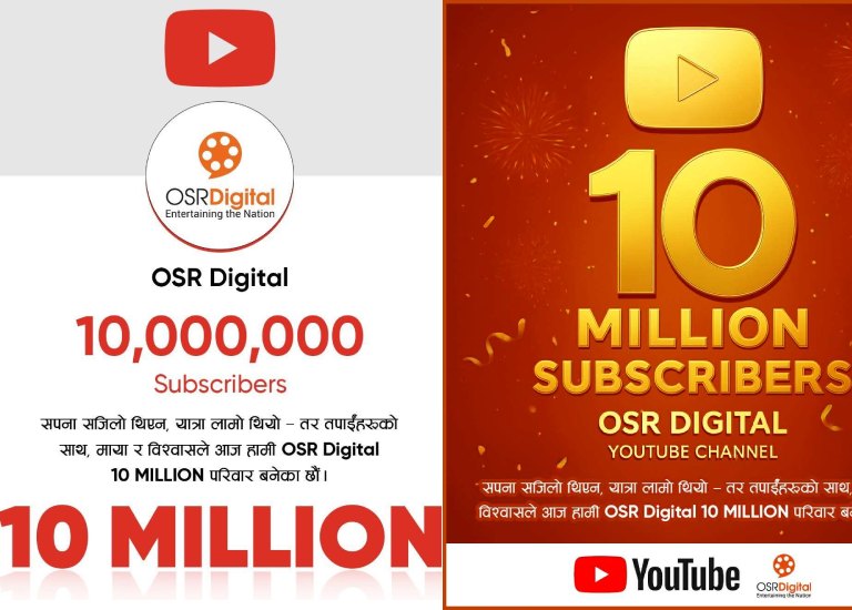 काठमाडौं । नेपाली डिजिटल बजारमा अग्रणी मानिने ओएसआर डिजिटल युट्युब च्यानलले १ करोड (१० मिलियन) सब्स्क्राइबर प्राप्त गर्दै नयाँ रेकर्ड कायम गरेको छ। व्यवसायिक तथा अफिसियल उत्पादन र वितरणमा सक्रिय च्यानलमध्ये १ करोड सब्स्क्राइबर पार गर्ने ओएसआर पहिलो नेपाली च्यानल बनेको छ।