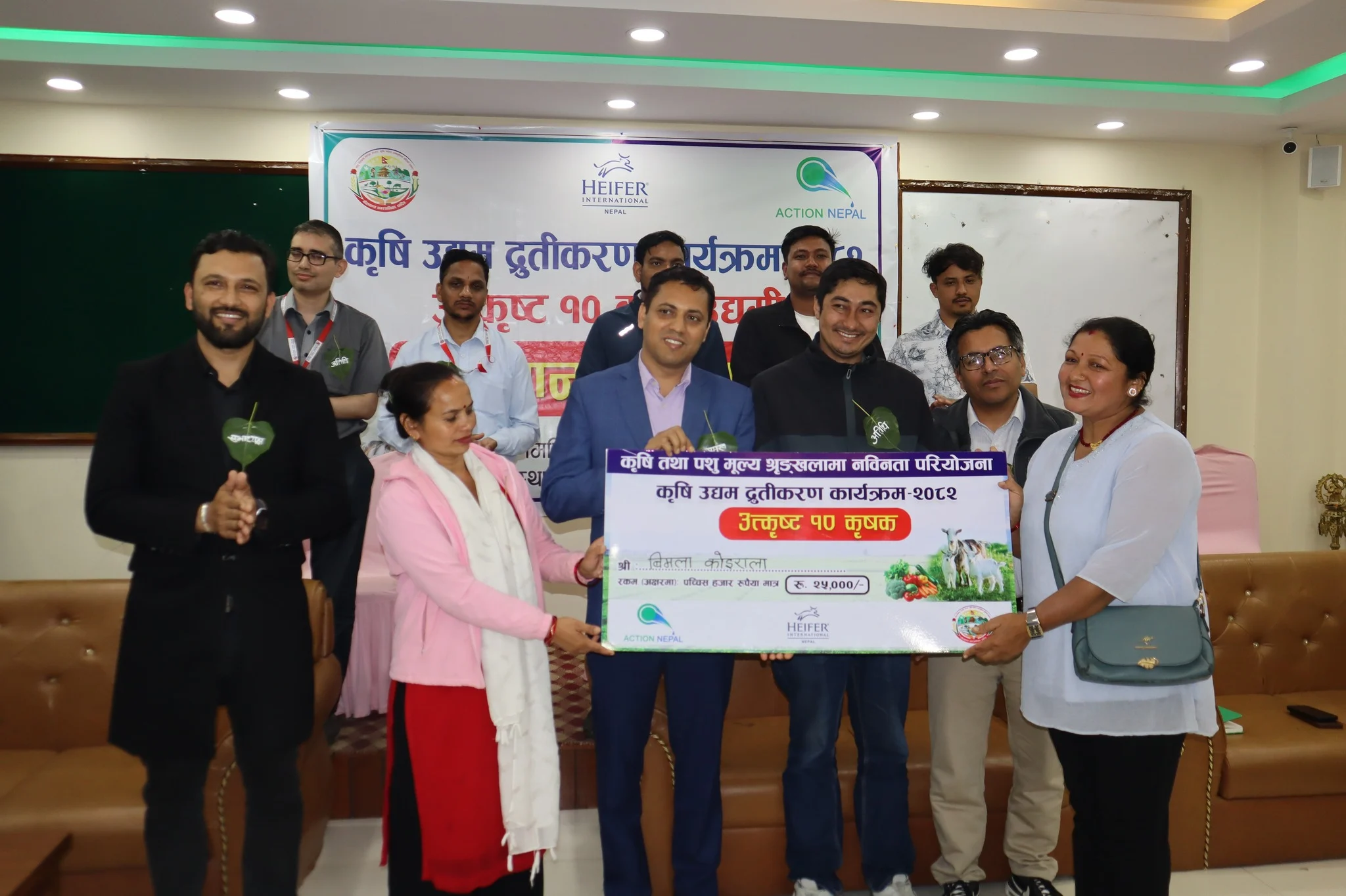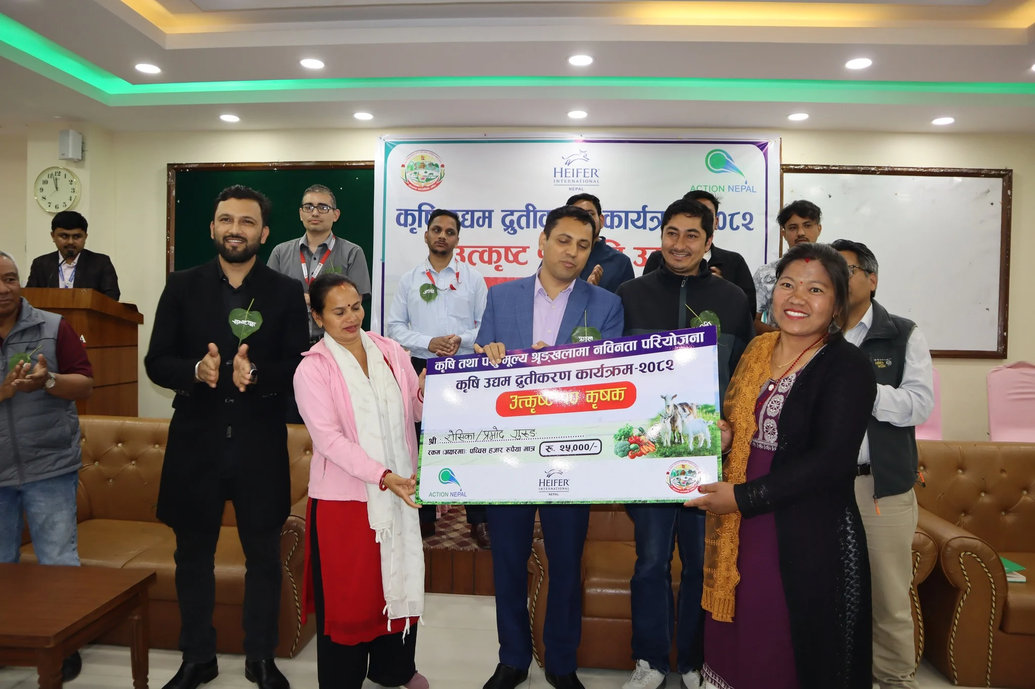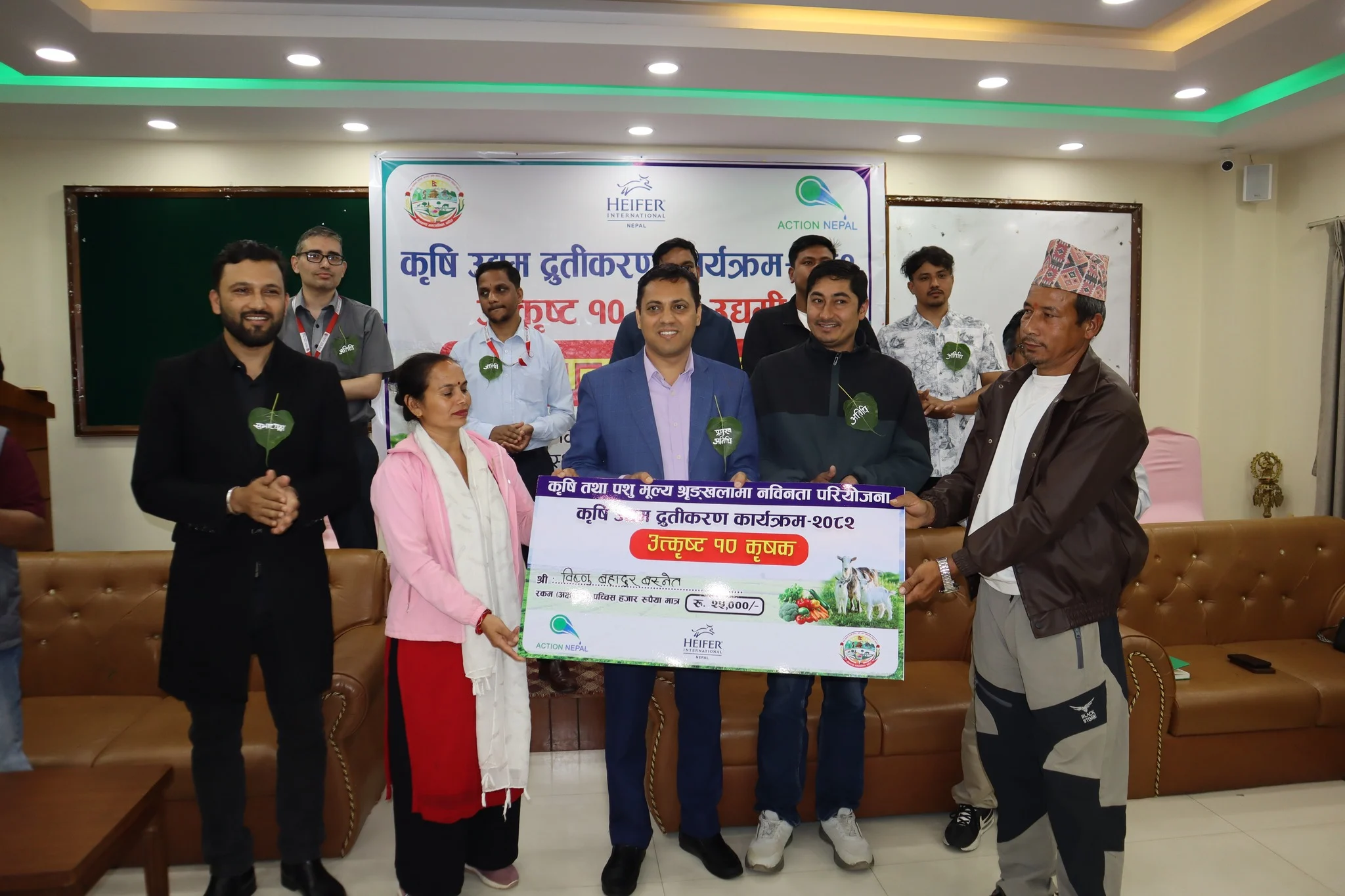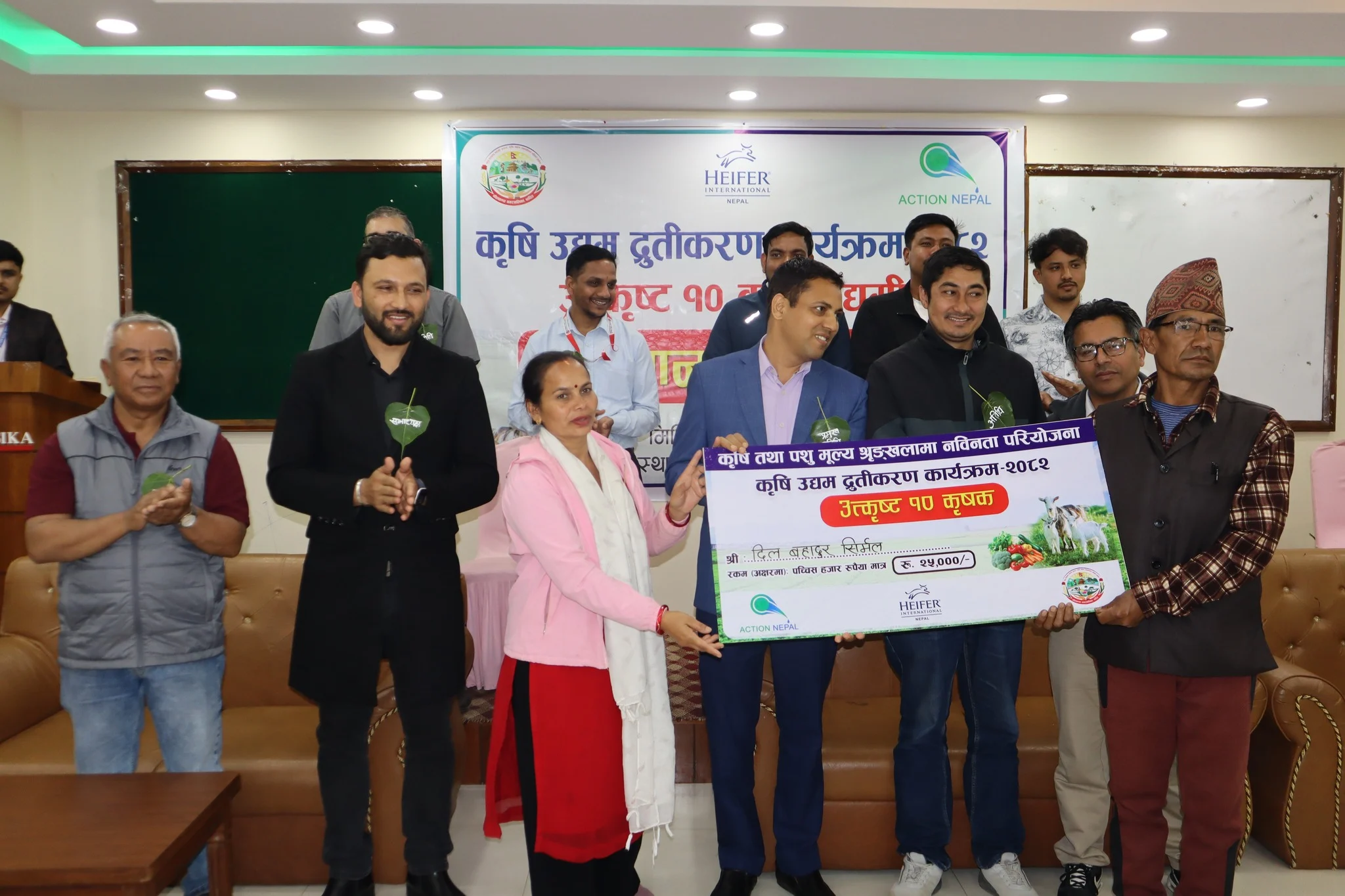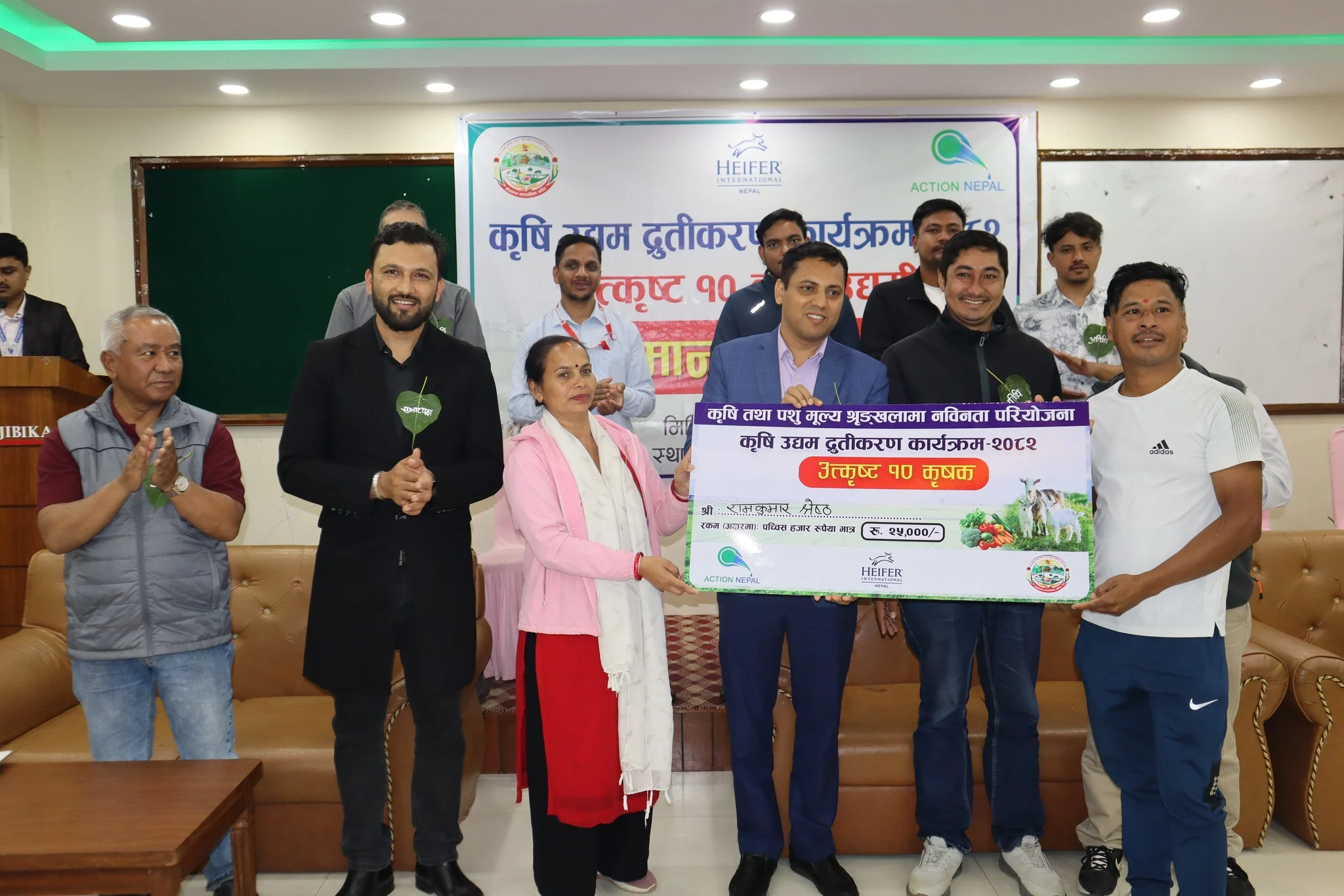 धादिङबेशी । एक्सन नेपालको आयोजना तथा हेफर इन्टरनेशनल र नीलकण्ठ नगरपालिकाको सहकार्यमा सञ्चालन गरिएको “कृषि उद्यम द्रुतीकरण कार्यक्रम–२०८२” अन्तर्गत उत्कृष्ट १० कृषि उद्यमीलाई सम्मान गरिएको छ। कार्यक्रममार्फत चयन भएका कृषकलाई जनही २५ हजार रुपैयाँसहित सम्मान गरिएको हो।
