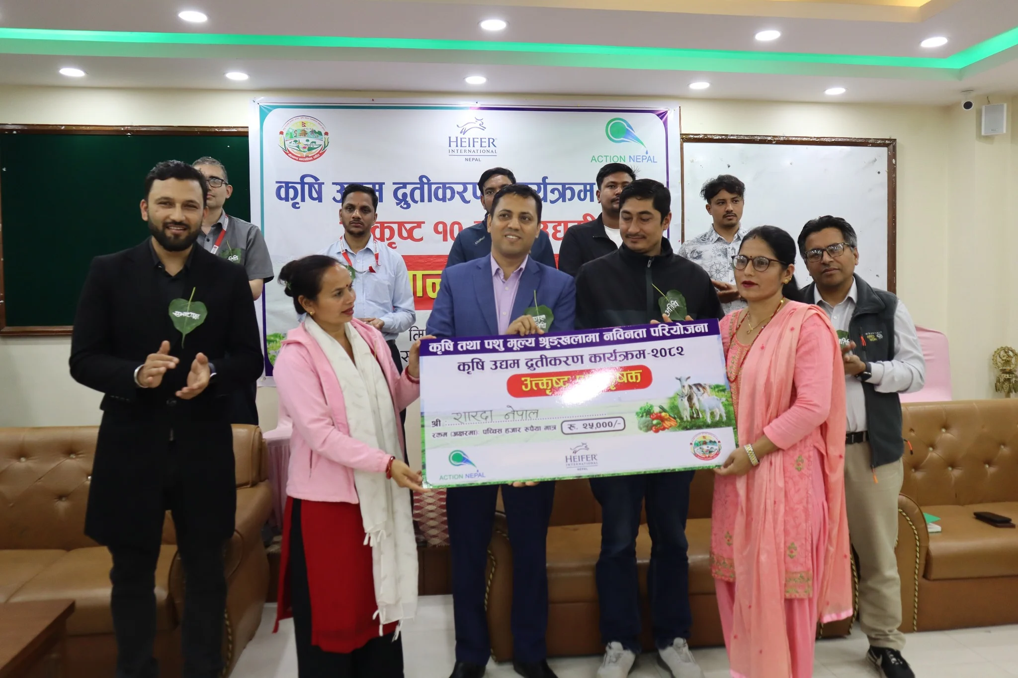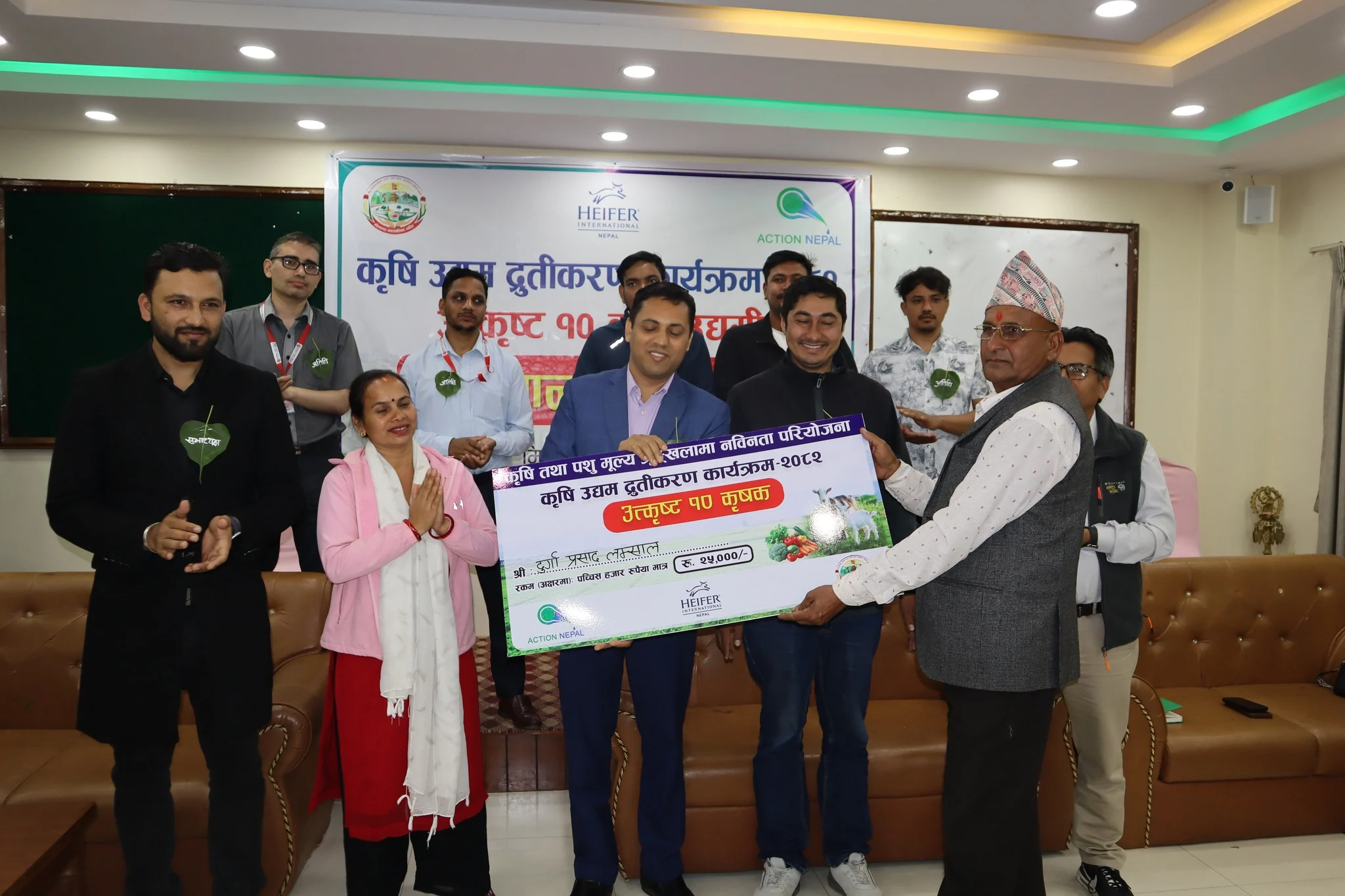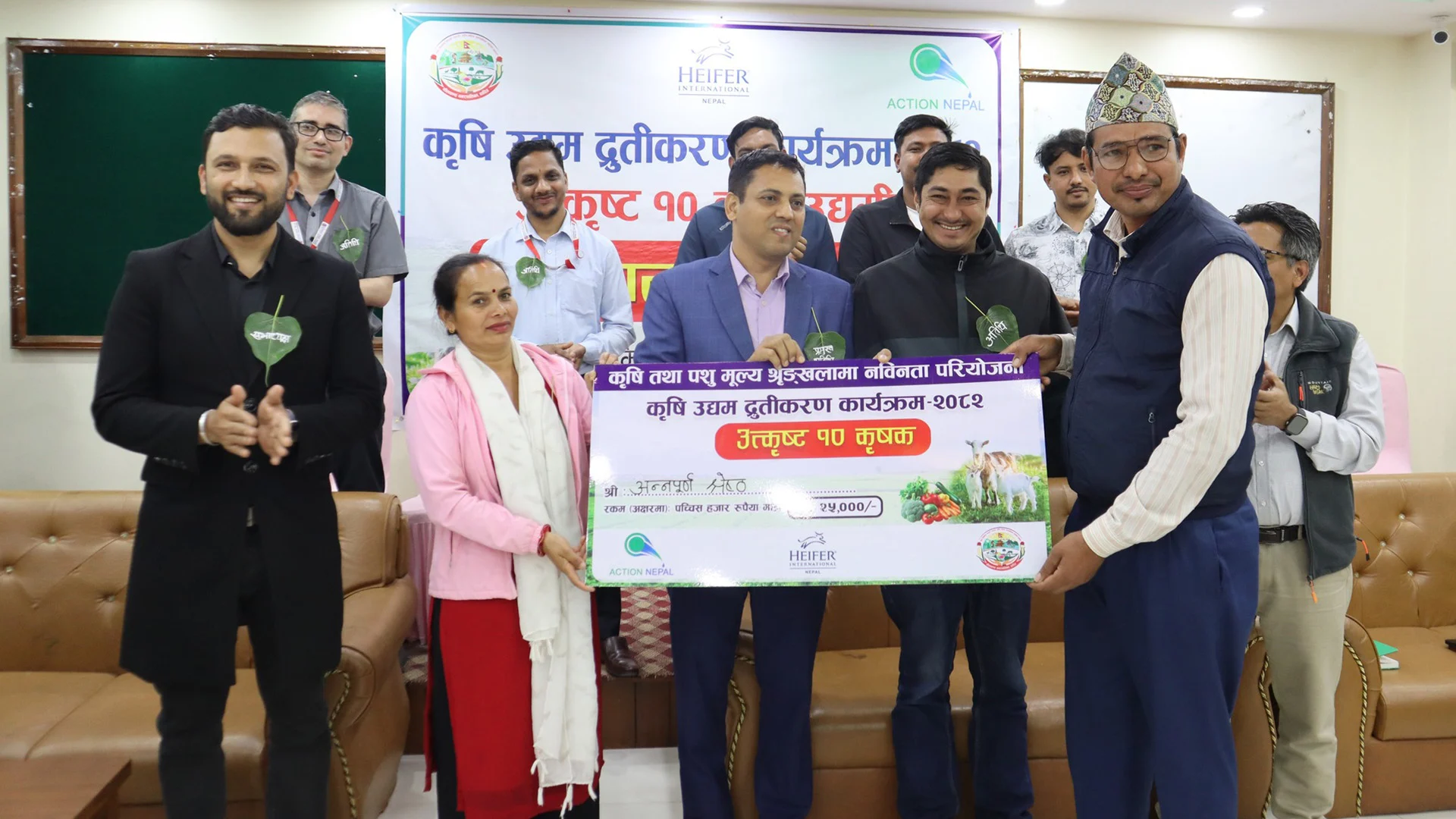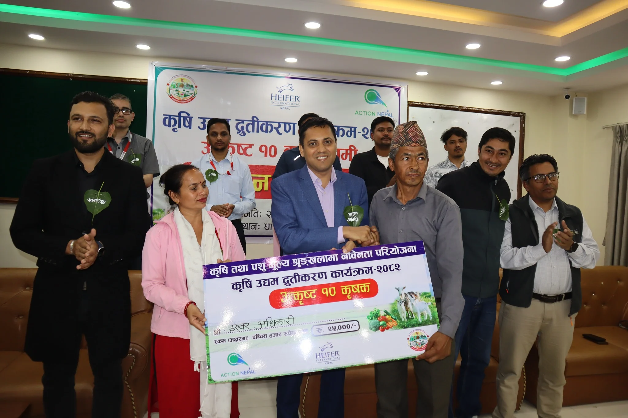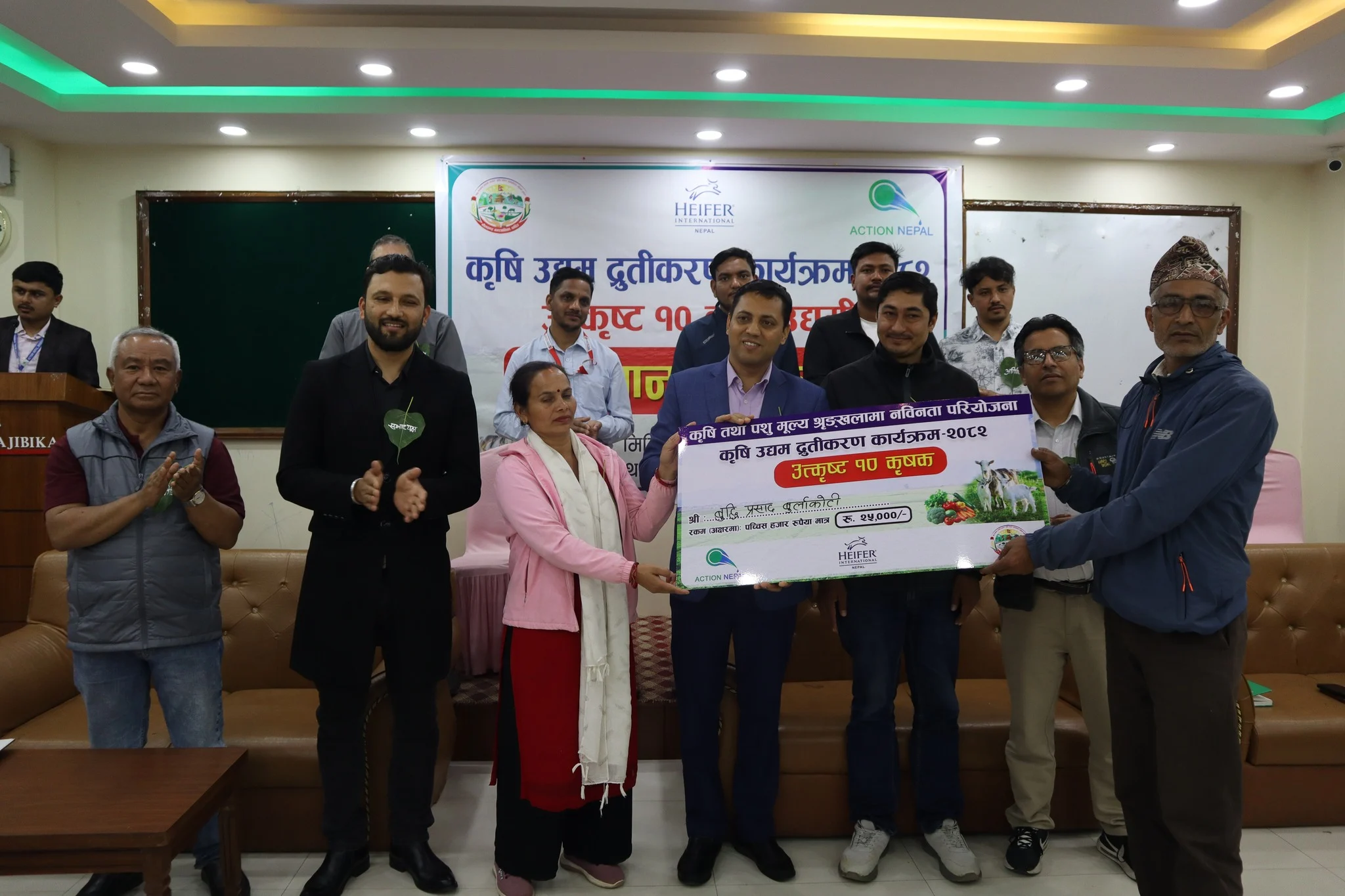 धादिङबेशी । एक्सन नेपालको आयोजना तथा हेफर इन्टरनेशनल र नीलकण्ठ नगरपालिकाको सहकार्यमा सञ्चालन गरिएको “कृषि उद्यम द्रुतीकरण कार्यक्रम–२०८२” अन्तर्गत उत्कृष्ट १० कृषि उद्यमीलाई सम्मान गरिएको छ। कार्यक्रममार्फत चयन भएका कृषकलाई जनही २५ हजार रुपैयाँसहित सम्मान गरिएको हो।